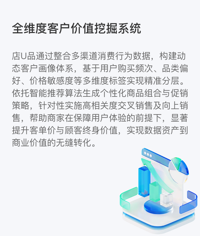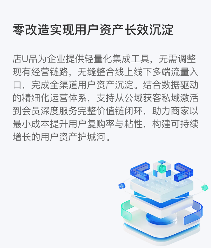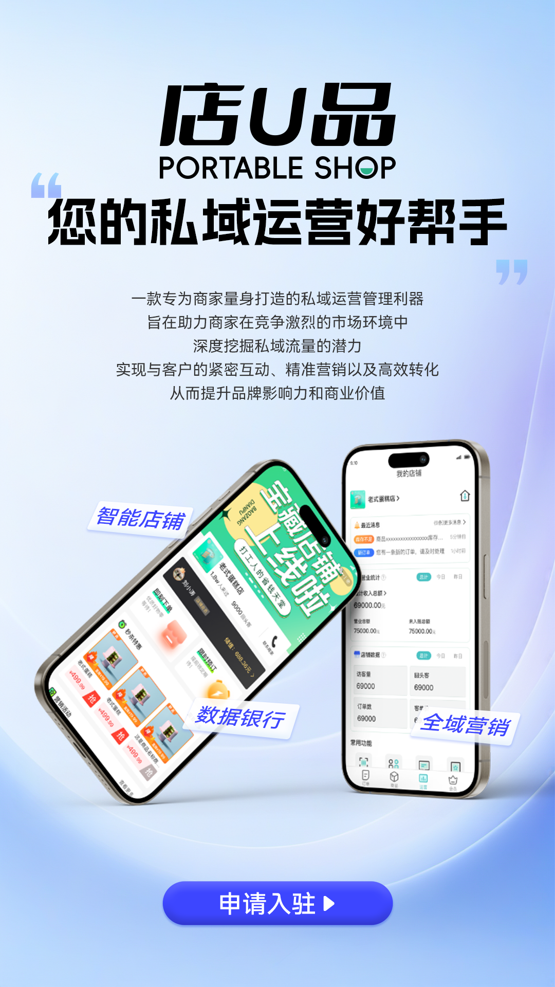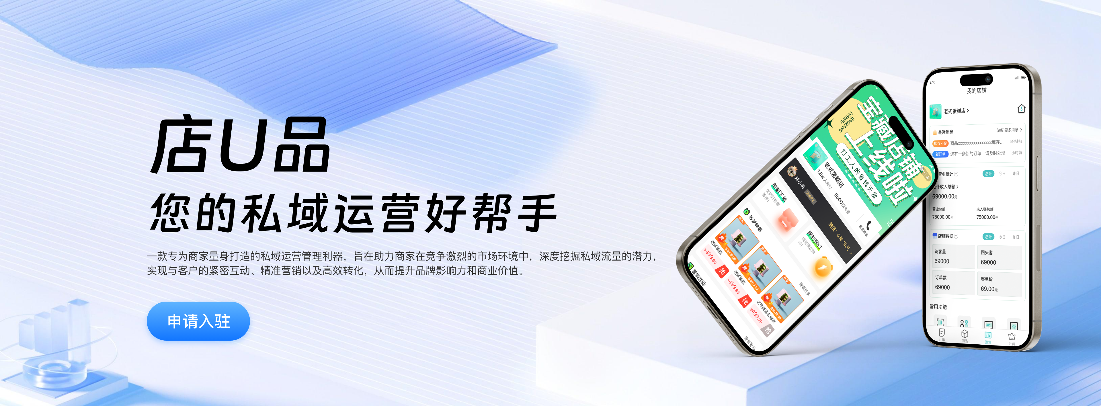 作为国内首个专注商家利益的全链路私域运营平台,店U品是由津财数科自主研发,首创「商家主权」运营模型,突破性实现「流量自主化+数据资产化+运营智能化」三位一体创新模式。通过构建独立私域生态,帮助商家: